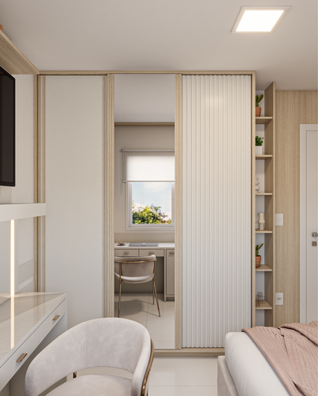 A escrivaninha, posicionada junto à janela, aproveita a iluminação natural para os estudos e se conecta a uma penteadeira, atendendo ao desejo de ter um cantinho dedicado ao autocuidado. Como o entretenimento também é parte importante da sua rotina, criamos um espaço que comporta uma TV maior, ideal para maratonar séries e filmes. O roupeiro com porta espelhada, indo até o forro, amplia visualmente o ambiente e contribui para a sensação de amplitude. Com a escolha de tons claros e amadeirados, o resultado é um espaço leve, acolhedor e multifuncional, feito sob medida para refletir a personalidade e as necessidades da cliente.